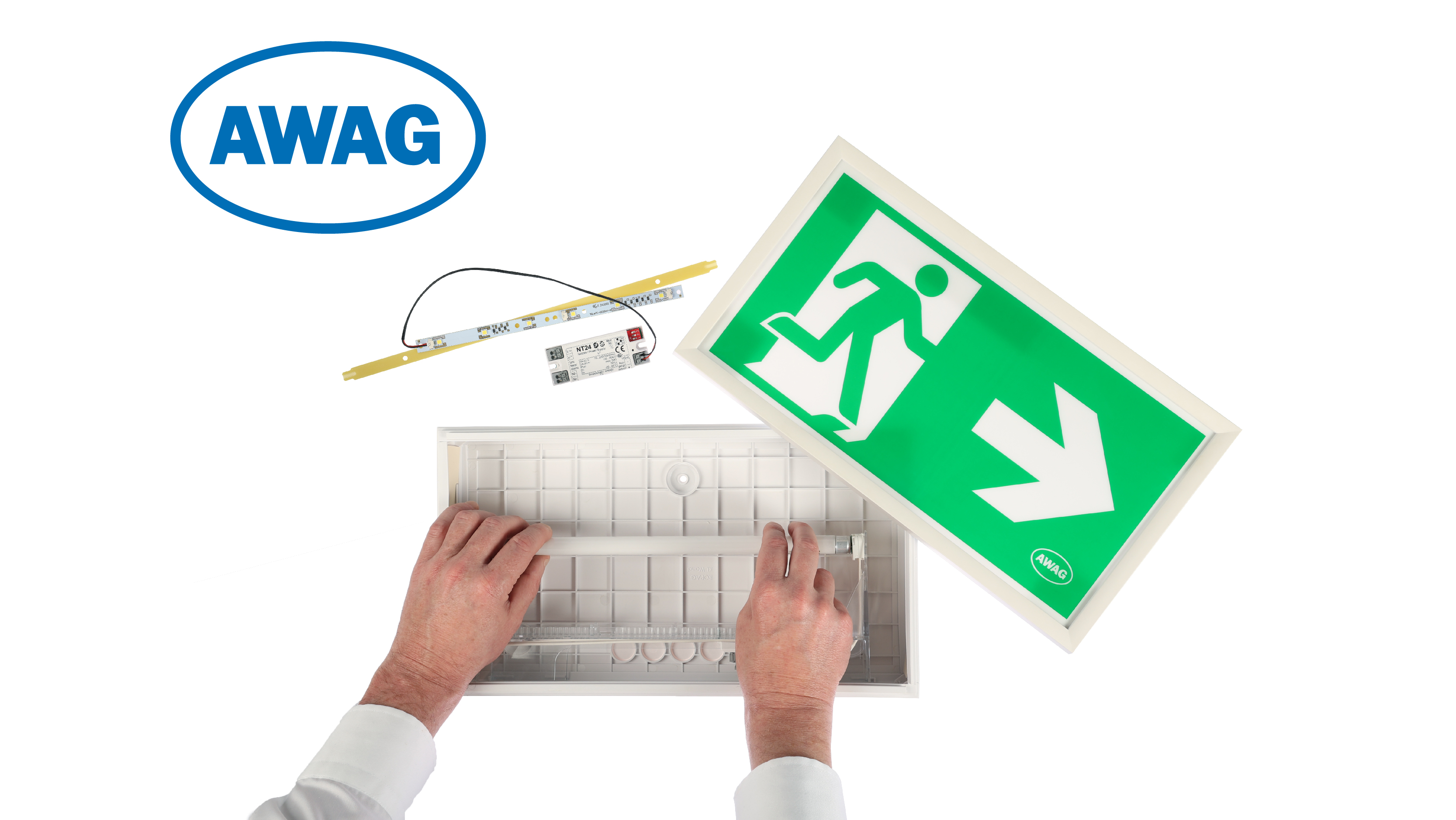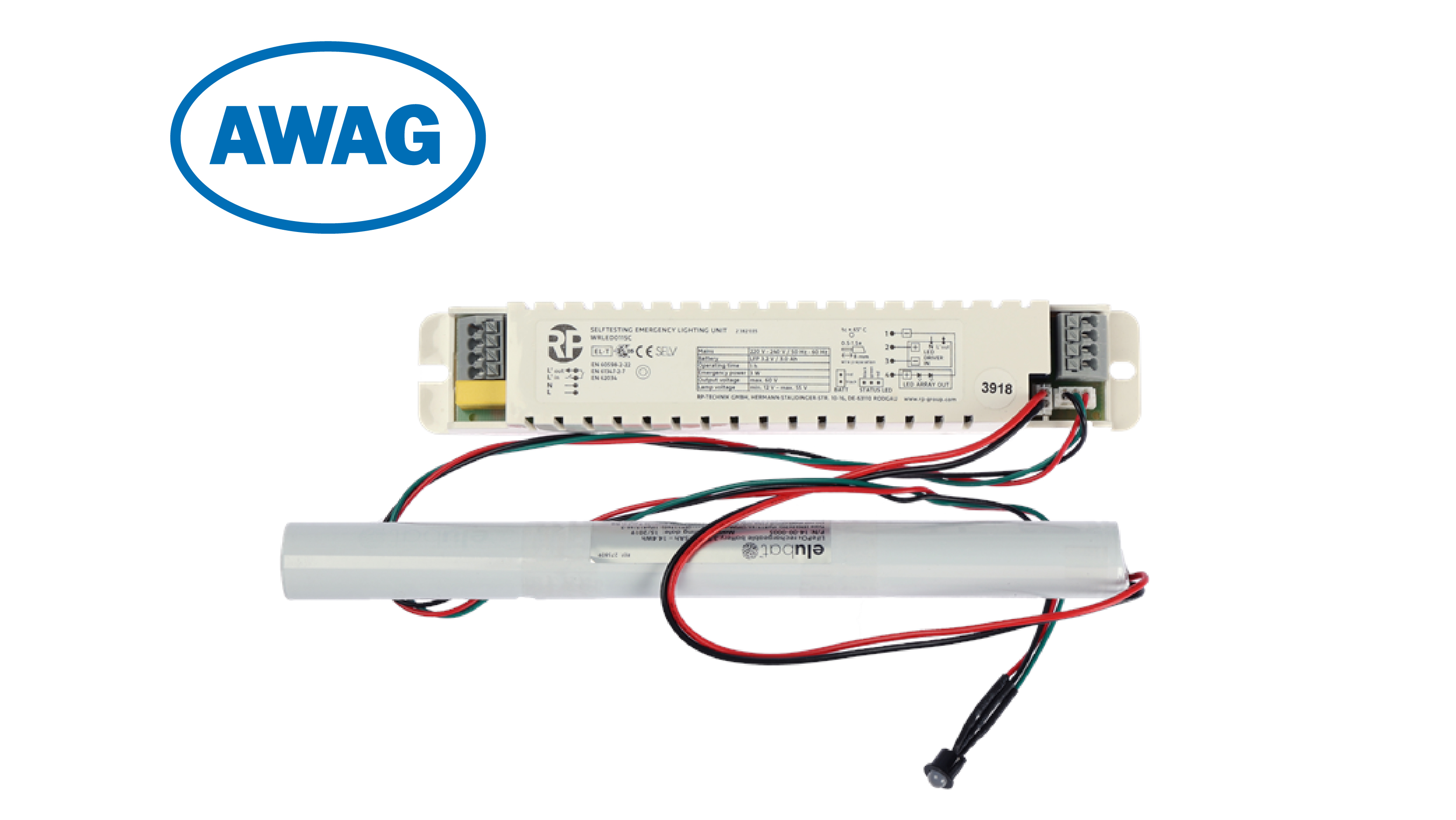AWAG LED-Umbauset für Fluoreszenzleuchten. Elektronischer Notlichteinsatz mit LED für den Umbau von Fluoreszenzleuchten. Mit integrierter Akku-Ladeeinrichtung und -Anzeige oder für Netzbetrieb geeignet. Auto- Funktionstest über externen Prüftaster.