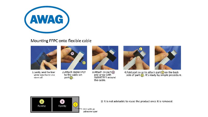 Das Produktdesign ermöglicht die EMV Abschirmung von oben und unten am FPC und FFC Leiter. Die PET Folie verhindert die Rissbildung und Streuung des Ferrits.