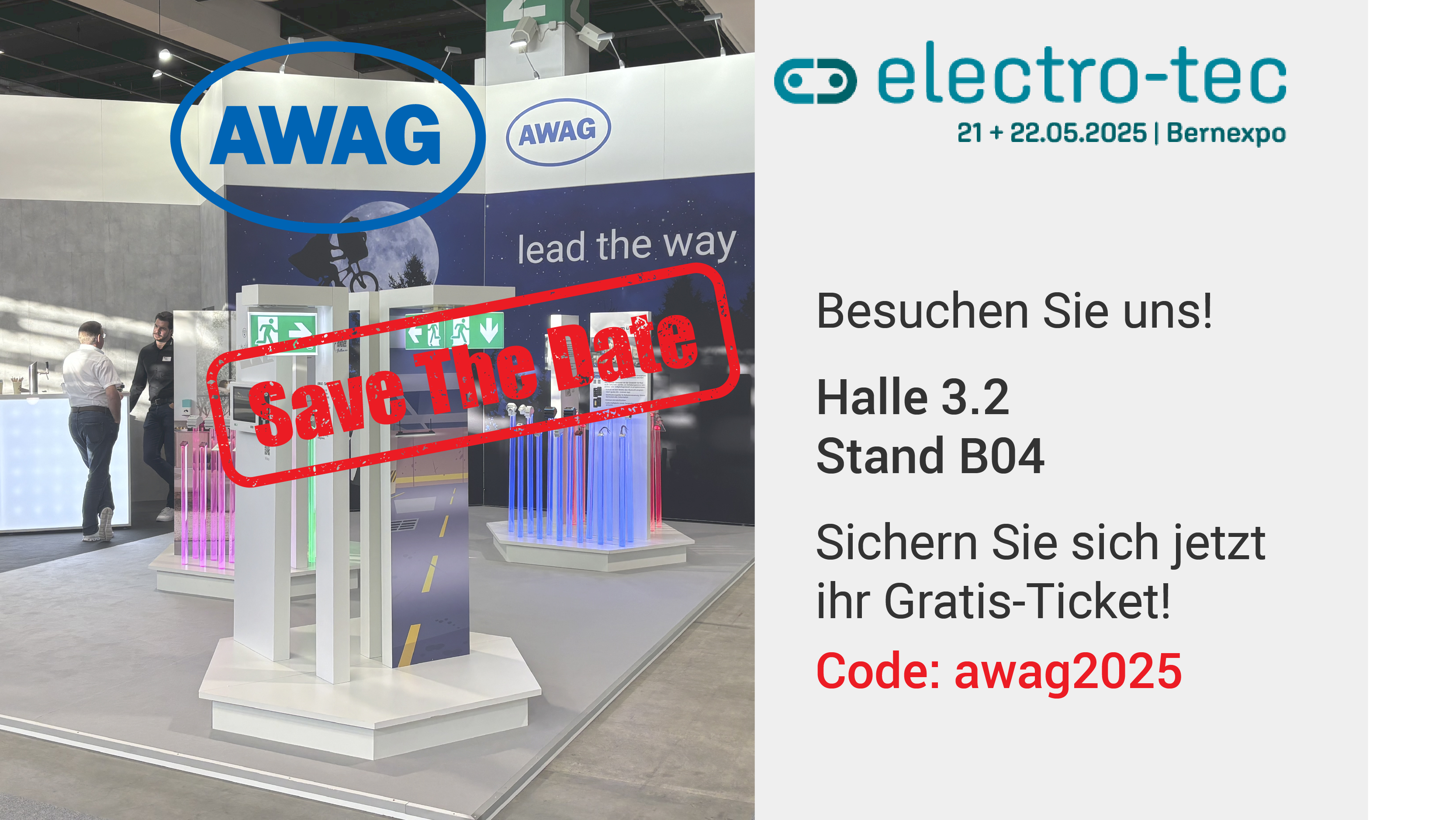 Am 21. & 22. Mai findet die «electro – tec» in Bern statt. Die AWAG Elektrotechnik AG ist als Aussteller vor Ort. Seien Sie mit dabei und sichern Sie sich ihr kostenloses Eintrittsticket mit dem Code: awag2025.