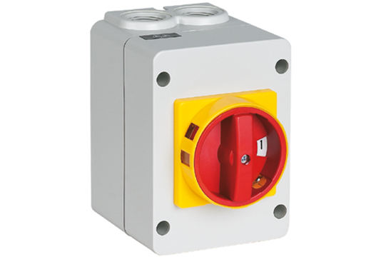 Lastschalter mit Sperrvorrichtung rot/gelb, 40A, 3-polig, IP65, Masse 93 x 140 mm, inklusive 4 vorbereiteten Einführungen M20.